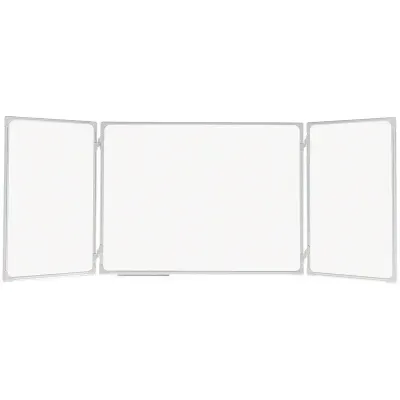 Трехэлементная настенная магнитно-маркерная доска предназначена для проведения презентаций и ведения практических занятий в различных группах. Лаковое покрытие предназначено для письма специальными маркерами для белой доски, а металлическая поверхность позволяет размещать информацию при помощи магнитов. Трехэлементная магнитно-маркерная доска имеет укрепленные пластиковые уголки, которые позволяют скрыть места крепления к стене. Алюминиевый профиль придает изделию дополнительную прочность и современный стильный внешний вид. Полочка для аксессуаров, держатели для бумажных блоков и элементы крепления входят в комплект. Центральная односторонняя секция – 120х90 см. Двусторонние боковые секции – 60х90 см каждая. Боковые секции крепятся к центральной при помощи шарниров. При должном уходе за рабочей поверхностью доски, поверхность магнитно-маркерной доски прослужит не менее 10 лет.
