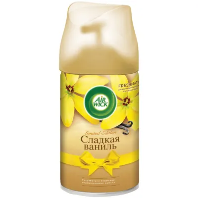 - Сменный баллон для освежителя воздуха Airwick Freshmatic "Сладкая ваниль", 250мл — это продукция бренда Airwick. В нашем магазине представлен широкий ассортимент товаров Airwick.