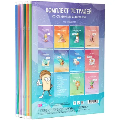 Комплект предметных тетрадей ArtSpace серии «Не по правилам» со справочным материалом на отдельных листах. В комплекте 12 предметов. Формат тетради – А5 (165*205 мм), вид крепления – скрепка. Внутренний блок состоит из 48 листов офсетной бумаги плотностью 60 г/м2 и белизной блока 100%. Тип линовки – клетка с полями. Обложка выполнена из целлюлозного картона с отделкой глянцевая ламинация. Необычный дизайн обложки обязательно понравится школьникам: весёлые герои поднимут настроение и скрасят время урока.
