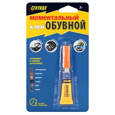 - Основные характеристики Клей Секунда, моментальный, обувной, 3г, блистер: Назначение: специальный, Вид товара: клей, Тип клея: контактный, Влагостойкость: да. Полный список характеристик доступен на странице товара.