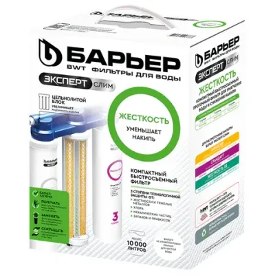 - Фильтр для воды БАРЬЕР "ЭКСПЕРТ СЛИМ Жесткость", 3 ступени, ресурс 10000 л, Н821Р06 — это продукция бренда БАРЬЕР. В нашем магазине представлен широкий ассортимент товаров БАРЬЕР.
