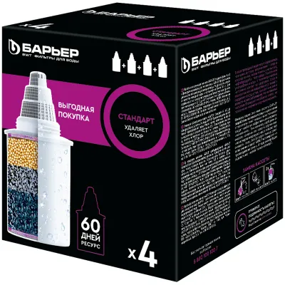 - Набор картриджей для фильтра Барьер 4 (для стандартной воды), 4шт. — это продукция бренда Барьер. В нашем магазине представлен широкий ассортимент товаров Барьер.