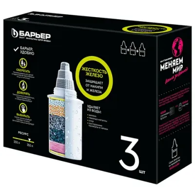 - Сменная кассета БАРЬЕР "Жесткость Железо" для жесткой и железистой воды, КОМПЛЕКТ 3 шт., ресурс 3х350 л, К303Р00 — это продукция бренда БАРЬЕР. В нашем магазине представлен широкий ассортимент товаров БАРЬЕР.