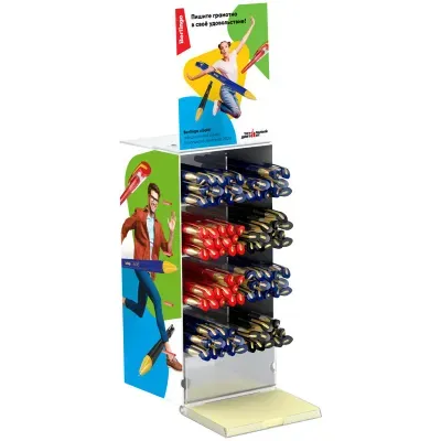 Прикассовый дисплей из прозрачного акрила включают 8 ячеек для пишущих принадлежностей и бумажный блок (для тестирования чернил). Яркий привлекательный дизайн с визуализацией проекта Тотальный диктант обеспечивает дополнительное внимание к выкладке товара и повышает вероятность импульсных покупок.