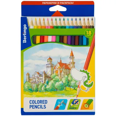 - Основные характеристики Карандаши цветные Berlingo "Замки", 18цв., заточен., картон, европодвес: Материал корпуса: Дерево, Форма корпуса: Шестигранная, Количество цветов: 18, Тип: Карандаши цветные. Полный список характеристик доступен на странице товара.