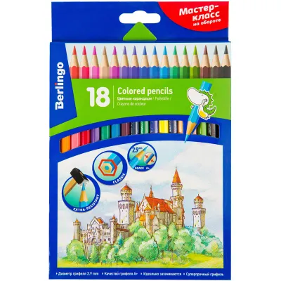 - Основные характеристики Карандаши цветные Berlingo "Замки", 18цв., заточен., картон, европодвес: Материал корпуса: Дерево, Форма корпуса: Шестигранная, Количество цветов: 18, Тип: Карандаши цветные. Полный список характеристик доступен на странице товара.