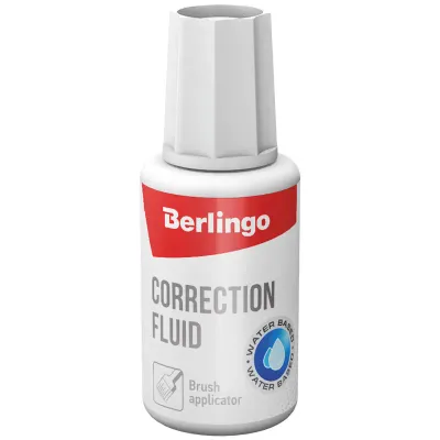 - Основные характеристики Корректирующая жидкость Berlingo, 20мл, водная, с кистью: Тип: Корректирующая жидкость, Объём: 20 мл, Вид аппликатора: Кисть, Морозоустойчивость: Нет. Полный список характеристик доступен на странице товара.