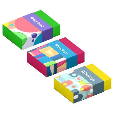 Каждый ластик упакован в картонный держатель и пленку, которые защищают ластик от грязи и пыли. У каждого изделия есть штрих-код. В ассортименте представлено 2 цвета ассорти.
