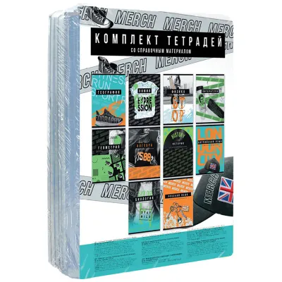 Комплект предметных тетрадей BG серия Merch со справочной информацией по предметам на форзаце и обороте. Формат тетрадей – А5, вид крепления – скрепка. Внутренний блок состоит из 48 листов офсетной бумаги плотностью 60 г/м2 и белизной блока 100%. Тип линовки – клетка/линия с полями. Обложки выполнены из мелованного картона с неоновой краской и имеют скруглённые углы. Стильный и универсальный дизайн тетрадей понравится ценителям необычного оформления канцелярских принадлежностей. В наборе 10 предметов: Алгебра, Английский язык, Биология, Геометрия, География, История, Литература, Русский язык, Физика и Химия. Комплект тетрадей упакован в термоплёнку с вкладышем.