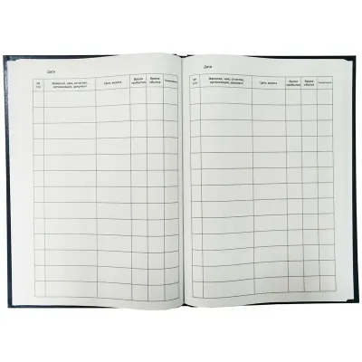 Книга регистрации посетителей А4 формата предназначена для регистрации посетителей и подходит для сотрудников контрольно-пропускных пунктов, администраторов, сотрудников постов охраны. Обложка – твердая, бумвинил с тиснением фольгой. Внутренний блок – офсетная бумага плотностью 55 г/м2, 96 листов. Вид крепления - сшивка.