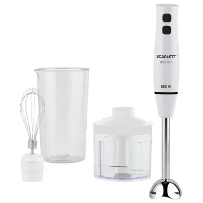 Блендер погружной SCARLETT SC-HB42F06, 850 Вт, 2 скорости, 3 насадки, стакан, белый