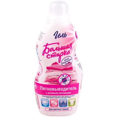 - Основные характеристики Пятновыводитель Большая стирка, гель, с активным кислородом, для цветных тканей, 1000мл: Тип: Пятновыводитель, Объём: 1 л, Для детского белья: Да, Для цветного белья: Да. Полный список характеристик доступен на странице товара.