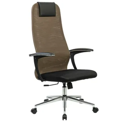 Спинка высокая, эргономичной формы, с ярко выраженной поясничной поддержкой. Спинка имеет сверхпрочный стальной каркас с износостойким полимерным покрытием черного цвета. Спинка снабжена мягким комфортным подголовником. Сиденье средней жесткости, объемное, на столярном каркасе. Обивка спинки из износоустойчивой "дышащей" сетчатой ткани двойного плетения. Подлокотники стальные нового поколения, с хромированными молдингами и мягкими накладками. Пятилучие металлическое хромированное, стильное и про