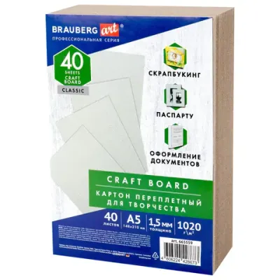- Картон переплетный, толщина 1,5 мм, А5 (148х210 мм), КОМПЛЕКТ 40 шт., BRAUBERG ART, 665559 — это продукция бренда BRAUBERG ART. В нашем магазине представлен широкий ассортимент товаров BRAUBERG ART.