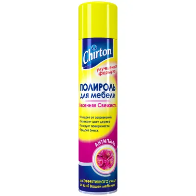 - Полироль для мебели Chirton "Антипыль Весенняя Свежесть", аэрозоль, 300мл — это продукция бренда Chirton. В нашем магазине представлен широкий ассортимент товаров Chirton.