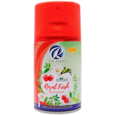 - Основные характеристики Сменный баллон для освежителя воздуха Chirton Rio Royal "Вишня и фрезия", 250мл: Тип: Сменный баллон для освежителя воздуха, Объём: 250 мл, Отдушка: Цветочная, Сухое распыление: Да. Полный список характеристик доступен на странице товара.