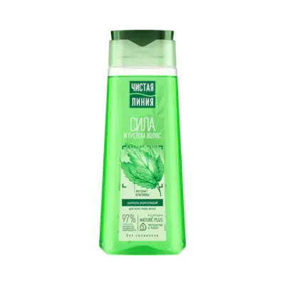 Шампунь для всех типов волос ЧИСТАЯ ЛИНИЯ "Экстракт крапивы" с усиленной формулой и в обновленном дизайне! Эксперты бренда ЧИСТАЯ ЛИНИЯ разработали укрепляющий шампунь на отваре целебных трав Крапива, который на 97% состоит из компонентов натурального происхождения и подходит для всех типов волос. Эссенция Nature Plus состоит из 5 тщательно отобранных по своим свойствам экстрактов и масел, предупреждает выпадение, питает и защищает волосы от повреждений. - Экстракт вербены обладает успокаивающ