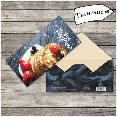 - Основные характеристики Конверт для денег Дарите Счастье "Вкусные блинчики", 80*165мм, фольга: Дизайн: День рождения, Материал: Картон, Тип: Конверт для денег, Размер: 80*165 мм. Полный список характеристик доступен на странице товара.