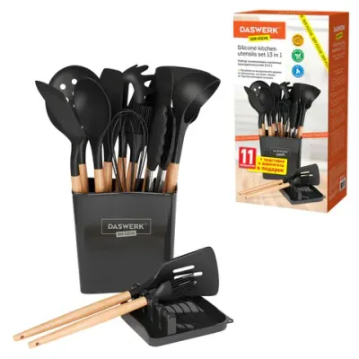 - Набор силиконовых кухонных принадлежностей с деревянными ручками 13 в 1, черный, DASWERK (ДАСВЕРК), 608197 — это продукция бренда DASWERK. В нашем магазине представлен широкий ассортимент товаров DASWERK.