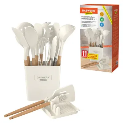 - Набор силиконовых кухонных принадлежностей с деревянными ручками 13 в 1, молочный, DASWERK (ДАСВЕРК), 608196 — это продукция бренда DASWERK. В нашем магазине представлен широкий ассортимент товаров DASWERK.