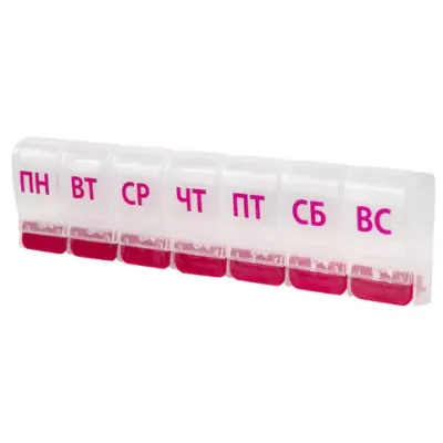 Таблетница MAXI представляет собой прозрачный пластиковый органайзер с 7 отделениями ПОВЫШЕННОЙ ВМЕСТИТЕЛЬНОСТИ, промаркированными в соответствии с днями недели. Таблетница поместится в сумке, её можно брать с собой на работу или в путешествие. Маркировка выполнена на русском языке при помощи специальной УФ печати. Надписи не сотрутся от длительного и частого использования. Прозрачный дизайн позволяет без труда контролировать прием лекарств. Каждое из 7 отделений оборудовано отдельной плотно