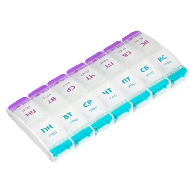 Таблетница MAXI представляет собой прозрачный пластиковый органайзер с 14 отделениями ПОВЫШЕННОЙ ВМЕСТИТЕЛЬНОСТИ, промаркированными по дням недели и суточному режиму приема: утро, вечер. Для удобства крышки утренних и вечерних отсеков отличаются по цвету. Таблетница поместится в сумке, её можно брать с собой на работу или в путешествие. Маркировка выполнена на русском языке при помощи специальной УФ печати. Надписи не сотрутся от длительного и частого использования. Прозрачный дизайн позво