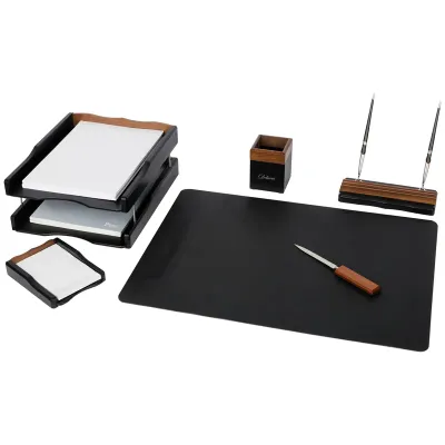 В состав набора входят: две шариковые ручки (17,9 см), деревянный лоток для бумаг с металлическими вставками (34*27,5*13 см), пластиковая подкладка (59*43,5*0,2 см), деревянная подставка-стакан под ручки и карандаши с металлической вставкой (2,5*8,8*3*4 см), деревянная подставка под бумажный блок (17*12,9*3 см), бумажный блок (15*10*0,7 см), деревянный стакан (8,2*8,2*10,5 см), нож с деревянной ручкой (23*2,8*1,2 см).
