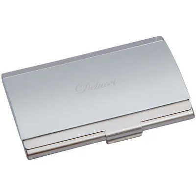 Карманная подарочная визитница Delucci сделана из металла с отделкой из матового алюминия, вмещает в себя до 15 визиток. Цвет серебристый.