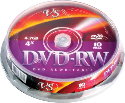 - Основные характеристики Диск DVD-RW 4.7Gb VS 4x Cake Box (10шт): Тип: Диск DVD-RW, Вид упаковки: На шпинделе, Возможность печати на поверхности диска: Нет, Диаметр: 12 см. Полный список характеристик доступен на странице товара.
