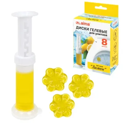 Диски гелевые, освежитель и очиститель для унитаза / писсуара, 8 дисков 44 г, LAIMA, "Лимон", шприц, 609795