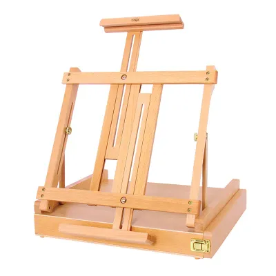 Этюдник имеет регулировку высоты верхнего фиксатора и нижней полки, которая позволяет работать с большими форматами сидя. Он складывается и снабжён ручкой для переноса, поэтому его удобно хранить и брать с собой. Изготовлен из лакированного бука.