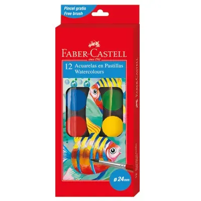 - Акварель Faber-Castell, 12 цветов, диаметр 24мм, с кистью, картон, европодвес — это продукция бренда Faber-Castell. В нашем магазине представлен широкий ассортимент товаров Faber-Castell.
