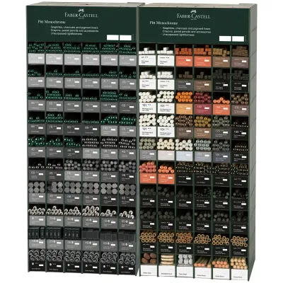 Дисплей художественных принадлежностей "Pitt Monochrome" от Faber-Castell состоит из 1106 предметов для творчества серии "Monochrome". Дисплей состоит из 2 модулей.