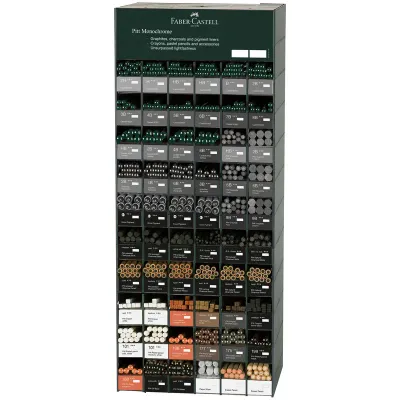 Дисплей художественных принадлежностей "Pitt Monochrome" от Faber-Castell состоит из 520 предметов для творчества серии "Monochrome".