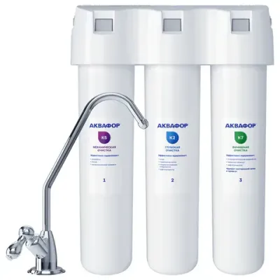 Фильтр очистит воду от хлора, органических соединений (в том числе фенолов), тяжелых металлов, ржавчины, остатков лекарственных средств. Очистка осуществляется при помощи 3 картриджей. "К5" – картридж защищает модули глубокой очистки от закупоривания, тем самым продлевая срок их жизни и снижая расходы на обслуживание фильтра. Рекомендуется для воды с большим содержанием песка, ржавчины и других механических примесей. "K2" – картридж глубокой сорбционной очистки. Эффективно удаляет из воды о