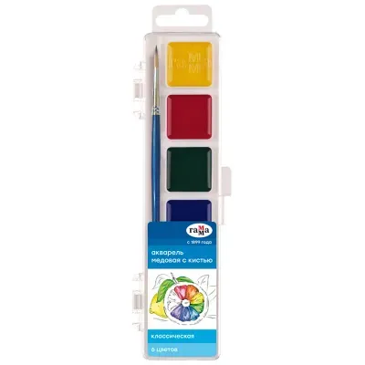 - Основные характеристики Акварель Гамма "Классическая", медовая, 06 цветов, с кистью, пластик. упак., европодвес NEW: Количество цветов: 6, Назначение: Для творчества, Тип: Акварель, Емкость: Кювета. Полный список характеристик доступен на странице товара.