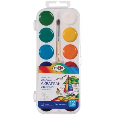 - Основные характеристики Акварель Гамма "Классическая", медовая, 12 цветов, с кистью, пластик. упак., европодвес: Количество цветов: 12, Назначение: Для творчества, Тип: Акварель, Емкость: Кювета. Полный список характеристик доступен на странице товара.