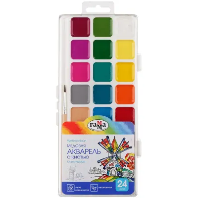 - Основные характеристики Акварель Гамма "Классическая", медовая, 24 цвета, с кистью, пластик. упак., европодвес: Количество цветов: 24, Назначение: Для творчества, Тип: Акварель, Емкость: Кювета. Полный список характеристик доступен на странице товара.