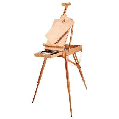 Оптимальное решение для работы в студии или на пленэре. Выдвижной ящик с металлической обивкой и модульной системой перегородок для удобного хранения художественных материалов, палитра в комплекте. Деревянные ножки регулируются по высоте, простая система крепления позволяет надежно зафиксировать холст.