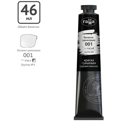 - Основные характеристики Гуашь художественная Гамма "Старый Мастер", белила цинковые, 46мл, туба: Цвет: Белый цинковый, Набор: Нет, Назначение: Художественные, Тип: Гуашь. Полный список характеристик доступен на странице товара.