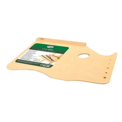 Полку-палитру легко установить на бортик пюпитра любого студийного мольберта ГАММА типа Лира или Станок. Её удобно держать в руке благодаря эргономичному отверстию для большого пальца. Оснащена держателями для кистей. Полка-палитра изготовлена из бука и фанеры.