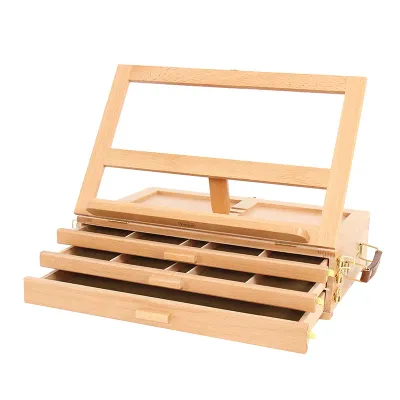 Сохраняет порядок на рабочем месте и не позволяет мелкам крошиться и осыпаться. Этюдник оснащён 3-мя выдвижными лотками с разделителями на зоны для сортировки мелков по типам и цветам. Также есть подставка для планшета и холста. Он складывается и снабжён ручкой для переноса, поэтому его удобно хранить и брать с собой. Изготовлен из лакированного бука.