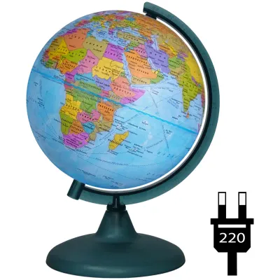 Глобус политический на пластиковой подставке и дуге с подсветкой диаметр 210мм. Призван дать представление о политическом устройстве мира. На нем, на общегеографической основе показаны границы государств и демаркационные линии, столицы и крупные населенные пункты, железные дороги и морские рейсы, научные станции в Антарктике, линии перемены дат
