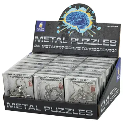 Металлический пазл представляет собой два и более элементов, изготовленных из стали диаметром 2,5 мм. Смысл решения головоломки состоит в том, чтобы разъединить ее части, а затем соединить обратно. В дисплее 24 разных по сложности головоломки. Уровни сложности определяются от 1 до 3, где 1 – несложная головоломка, 3 – сложная. Решение каждой головоломки находится внутри индивидуальной упаковки.