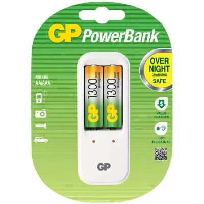 GP PowerBank серии STANDARD - экономия средств, безопасный заряд и удобство обращения. Если Вам нужно зарядить аккумуляторы типоразмеров ААА, АА просто поместите Ваши аккумуляторы в устройство и оставьте их заряжаться на всю ночь. Автоматический таймер гарантирует безопасный процесс заряда, после которого Вы можете вытащить заряженные аккумуляторы, когда они Вам понадобятся. Безопасный заряд в течение ночи. Индикатор статуса заряда аккумулятора. Два канала для заряда позволяют заряжать 1- 2 никель-металлгидридных аккумулятора типоразмеров АА или ААА