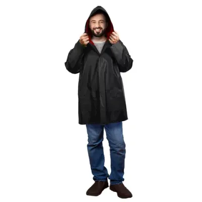 Дождевик-куртка универсального размера с капюшоном изготовлена из плотного водозащитного материала – поливинилхлорида (PVC). Застегивается на 4 пары кнопок из полипропилена (PP). В капюшоне есть кулиска с пластиковыми наконечниками. Карманы с влагозащитными клапанами на кнопках. Рукава сужаются книзу. Края рукавов, полочек и низ изделия подогнуты и надежно проклеены. Супер-прочный и стойкий материал. Для многоразового использования. Длина по спинке (от воротника до нижнего края) – 90 см. Полуоб