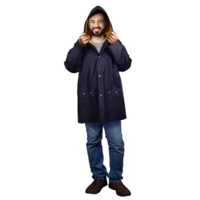 Дождевик-куртка универсального размера с капюшоном изготовлена из плотного водозащитного материала – поливинилхлорида (PVC). Застегивается на 4 пары кнопок из полипропилена (PP). В капюшоне есть кулиска с пластиковыми наконечниками. Карманы с влагозащитными клапанами на кнопках. Рукава сужаются книзу. Края рукавов, полочек и низ изделия подогнуты и надежно проклеены. Супер-прочный и стойкий материал. Для многоразового использования. Длина по спинке (от воротника до нижнего края) – 90 см. Полуоб
