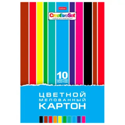 - Картон цветной А4 МЕЛОВАННЫЙ, 10 листов 10 цветов, в папке, HATBER, 195х280 мм, "Creative Set", 008891, 10Кц4_05809 — какой бренд?