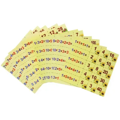 Комплектность: 12 картонных листов с цветными карточками 80×40 мм (100 шт. с примерами) и 40×40 мм (100 шт. с ответами), правила игры