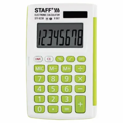 - Калькулятор карманный STAFF STF-6238 (104х63 мм), 8 разрядов, двойное питание, БЕЛЫЙ С ЗЕЛЁНЫМИ КНОПКАМИ, блистер, 250283 — это продукция бренда STAFF. В нашем магазине представлен широкий ассортимент товаров STAFF.